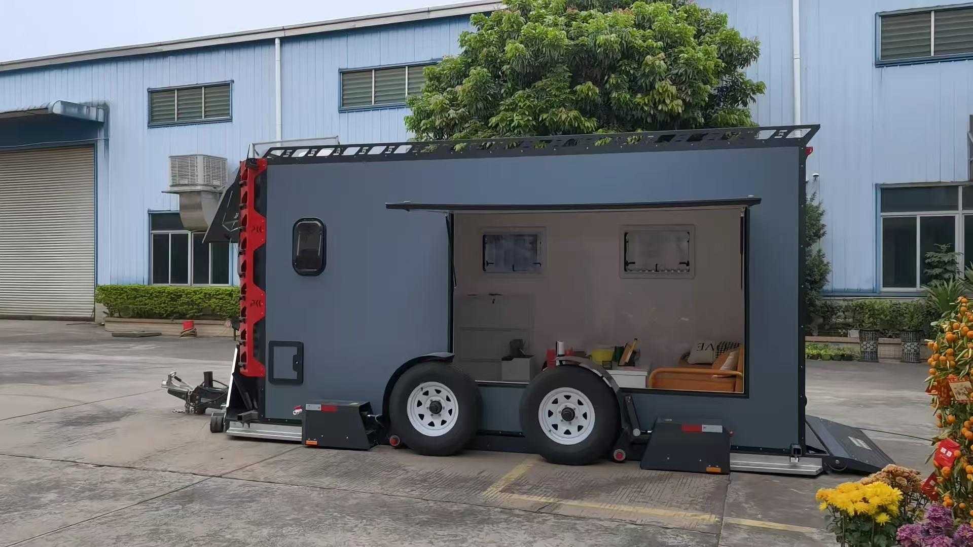 Opremljen z električnim hidravličnim dvižnim sistemom in brezžičnim daljinskim upravljalnikom, omogoča upravljanje dviganja ploščadi in odvijanja zadnje plošče z enim ključem. Vozila lahko zapeljejo na prikolico neposredno brez dodatnih klančin ali viličarjev. Ena oseba lahko dokonča nakladanje in razkladanje, kar močno izboljša delovno učinkovitost, zaradi česar je idealen za scenarije pogostega prevoza.