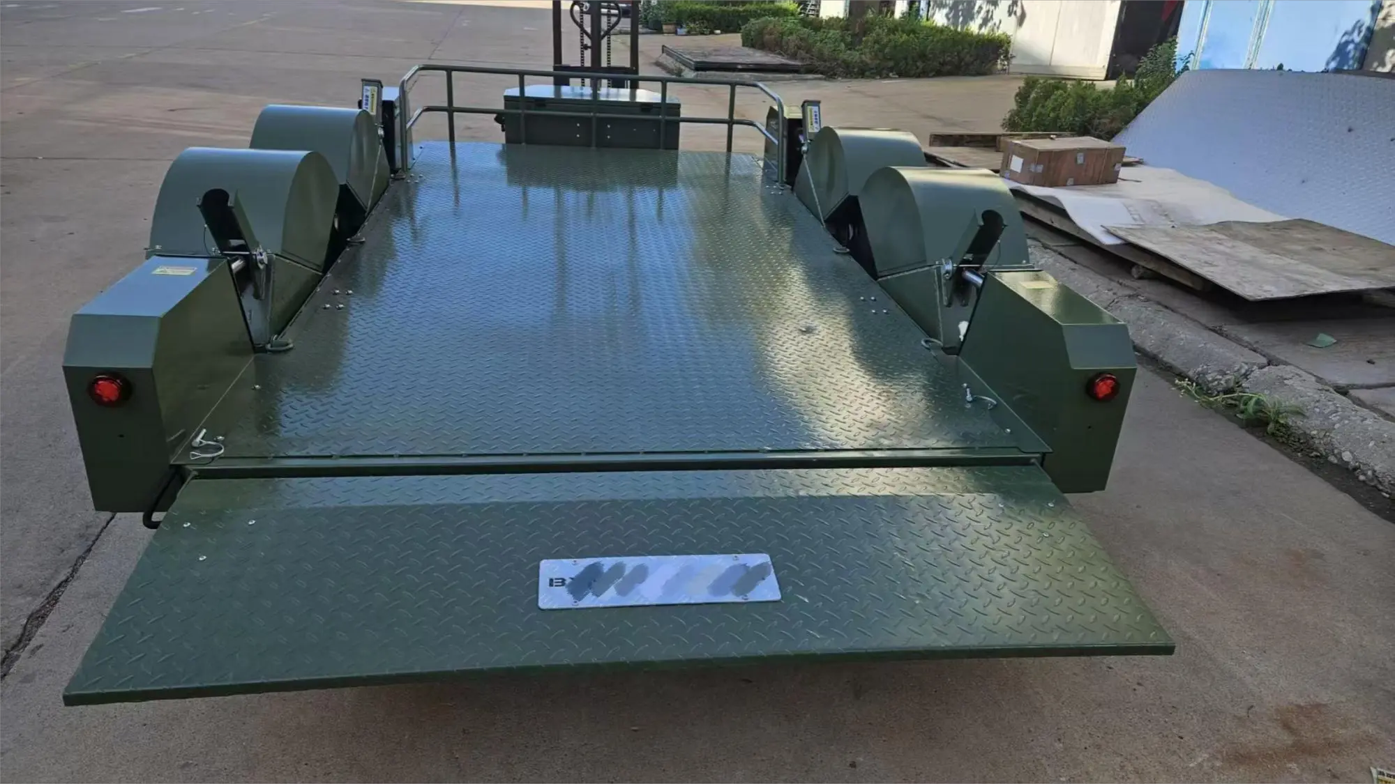 Celotna platforma ima diamantne protizdrsne jeklene plošče. Odporna proti obrabi in nedrseča površina lahko prenese neposredno (kotaljenje) strojev na gosenicah, kar učinkovito preprečuje zdrs tovora ali vozil med prevozom.
