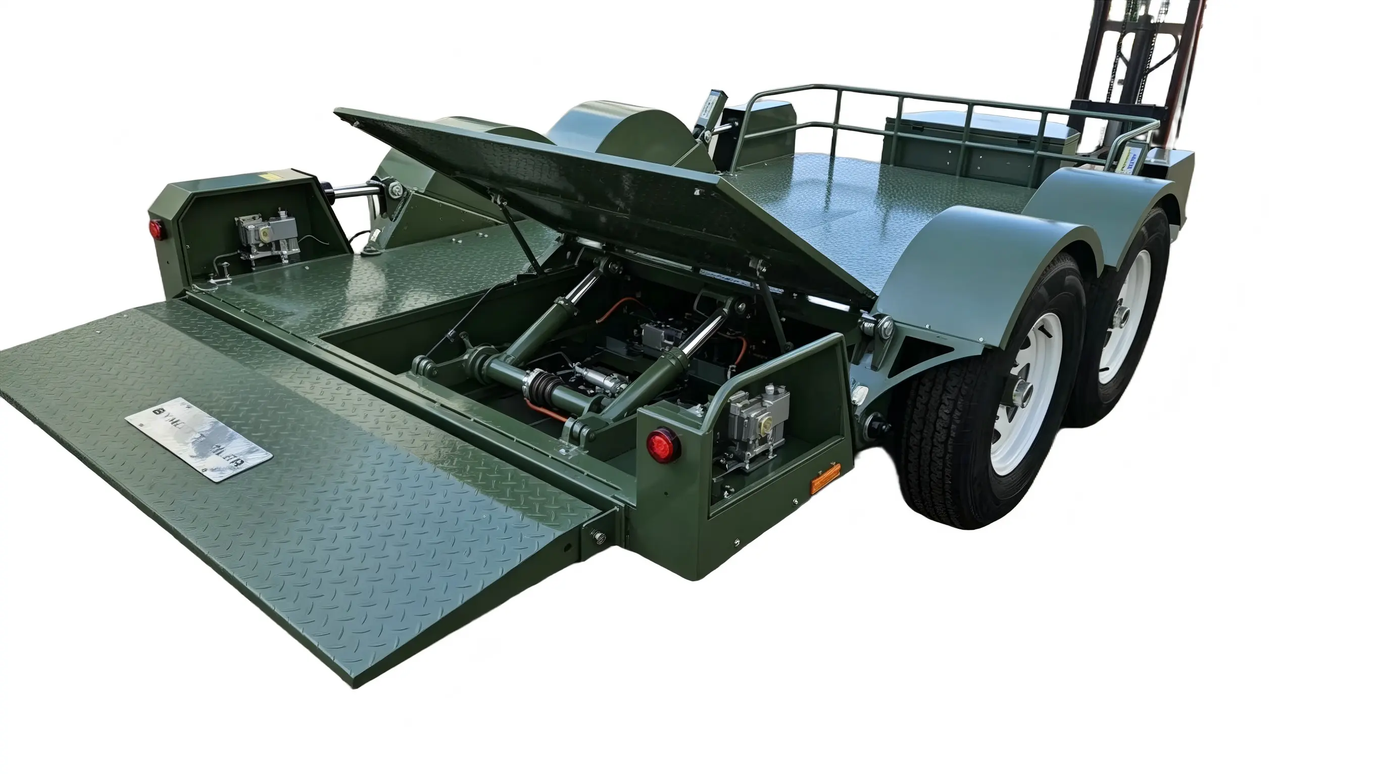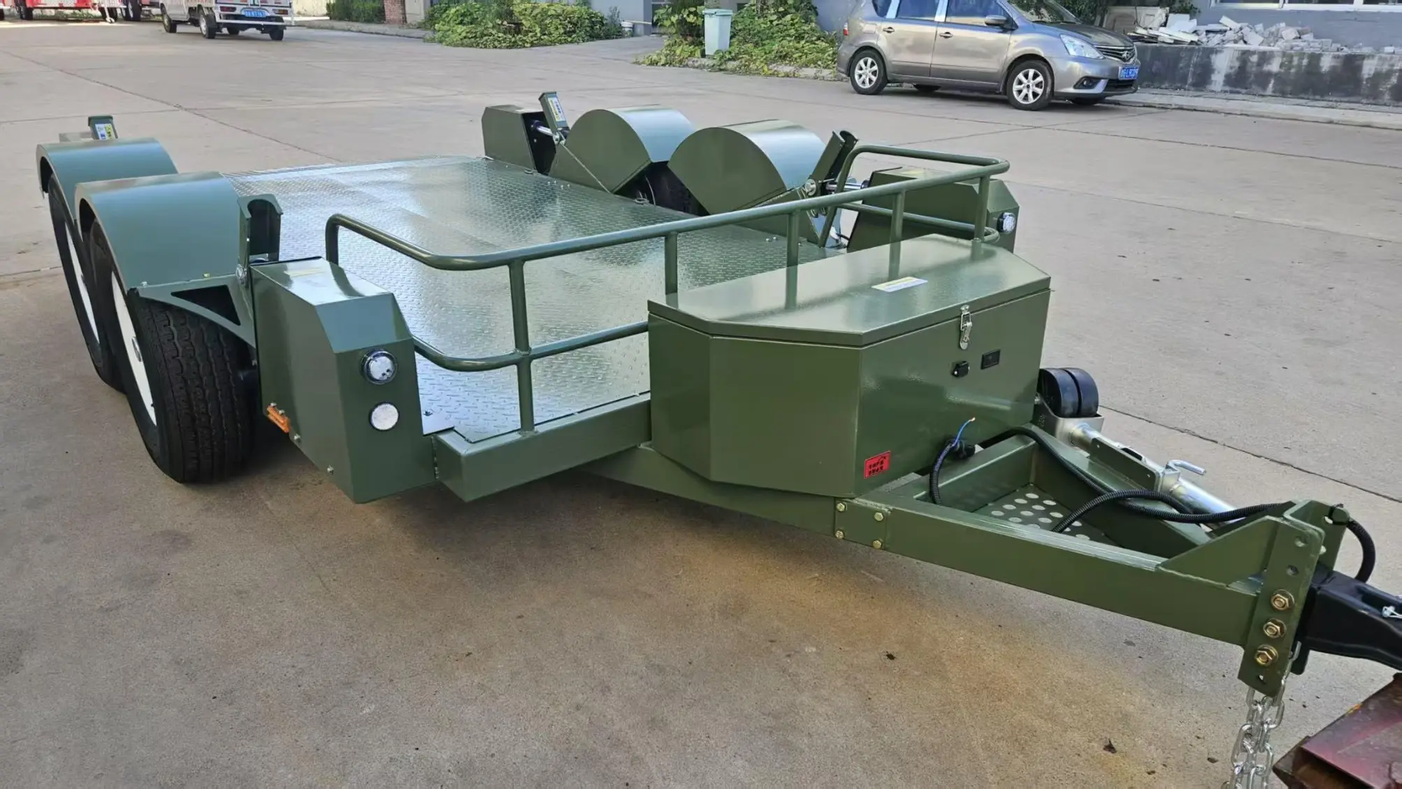 5-tonska dvoosna hidravlična dvižna prikolica je težka priklopna ploščad, zasnovana posebej za prevoz srednje in težke opreme, vozil in materialov. Vključuje stabilno dvoosno šasijo in integriran hidravlični dvižni sistem. Brez pomožne opreme, kot so viličarji ali lestve, je ploščad mogoče spustiti blizu tal, jo stabilno dvigniti in spustiti ter izvesti samonakladanje in razkladanje. Z robustno splošno strukturo, zanesljivo nosilnostjo in preprostim upravljanjem se široko uporablja pri premeščanju gradbenih strojev, transportu vozil, ravnanju s tovarniško opremo, prenosu kmetijskih strojev in drugih scenarijih, saj služi kot učinkovit in praktičen kos opreme za 5-tonski prevoz težkega tovora.
